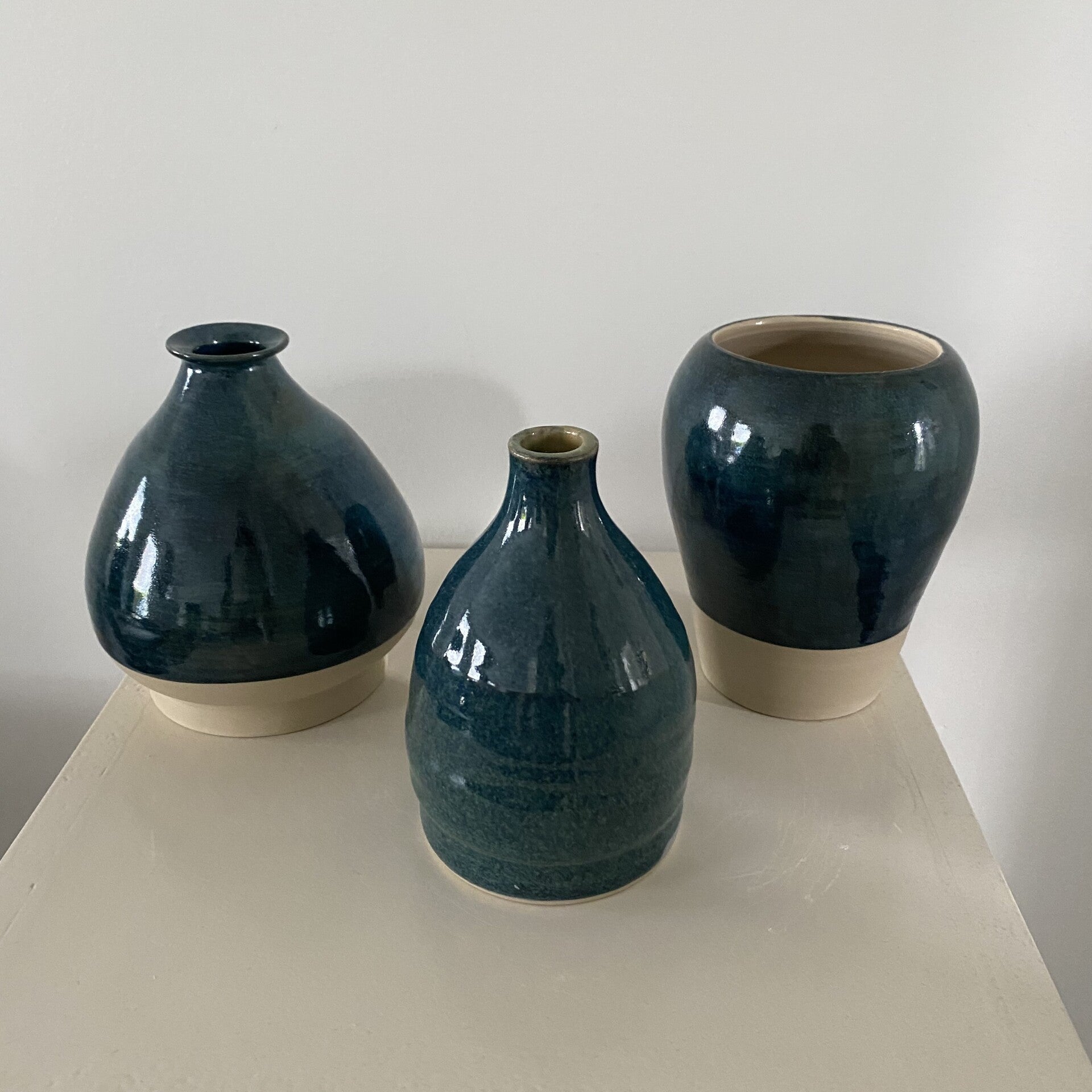 G14. Set van 3 vaasjes, donker petrolgroen glans
